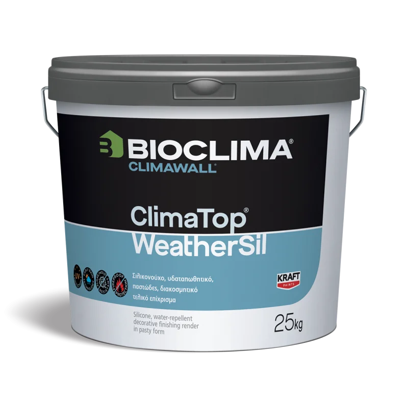 Το ClimaTop® WeatherSil είναι ένα ινοπλισμένο σιλικονούχο παστώδες διακοσμητικό τελικό επίχρισμα με νέας τεχνολογίας σιλικονούχες ρητίνες, που προσφέρει ολοκληρωμένη προστασία ενάντια στις έντονες καιρικές μεταβολές, στις απότομες βροχοπτώσεις, στους ρύπους, στην ανάπτυξη μούχλας και άλγεων και στην έντονη ηλιακή ακτινοβολία.