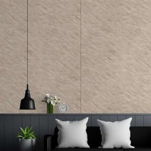 SPC panel επένδυσης τοίχου της συλλογής Rocko Tiles με μπεζ δημιουργικό ντεκόρ και διακριτική, σύγχρονη αισθητική.