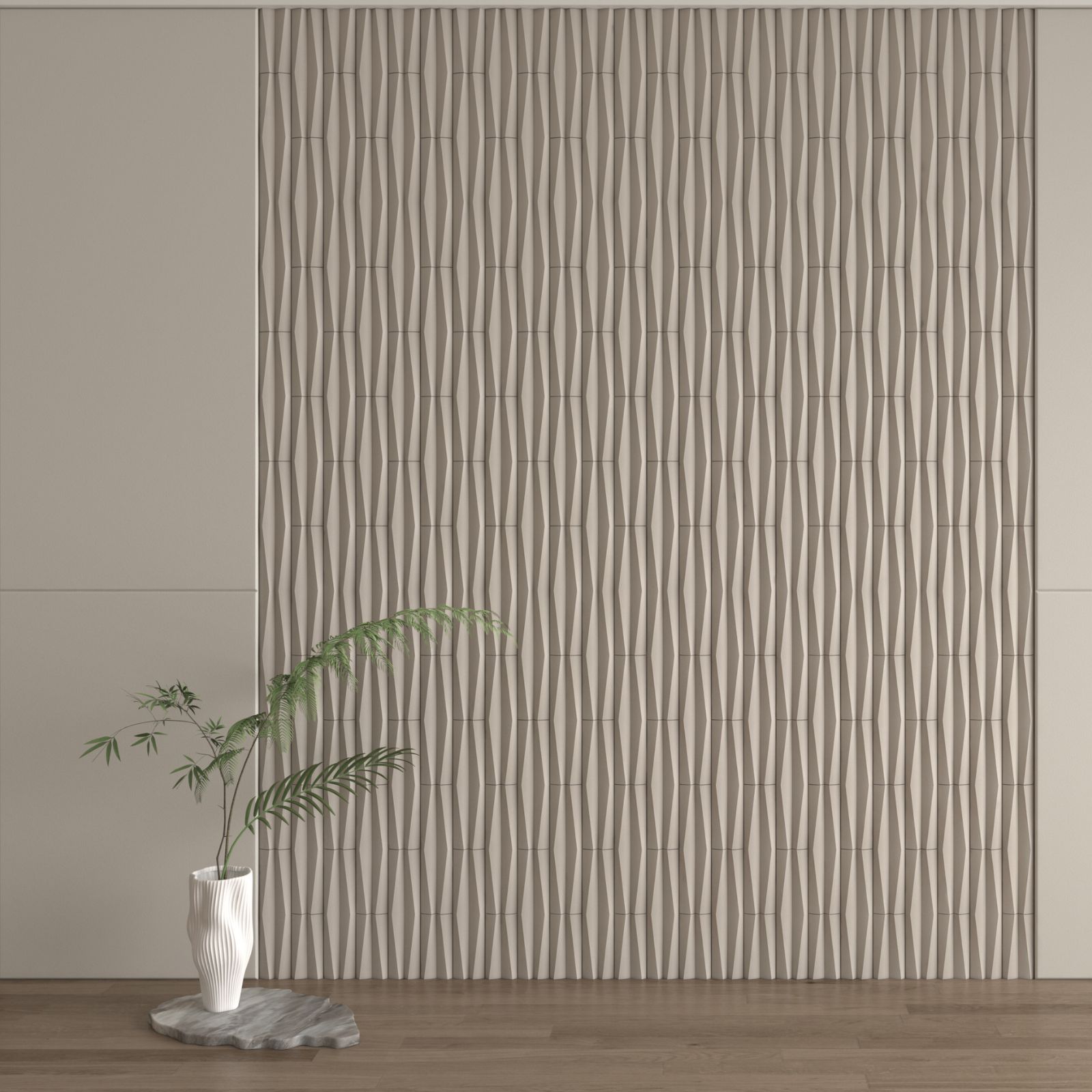 Το σχέδιό του βασίζεται σε επαναλαμβανόμενες πρισματικές μορφές που δημιουργούν ρυθμό, βάθος και δυναμικές φωτοσκιάσεις κατά μήκος του τοίχου. Η απόχρωση Light Black ενισχύει το contrast της επιφάνειας, προσφέροντας μοντέρνο και αρχιτεκτονικά αυστηρό αποτέλεσμα.