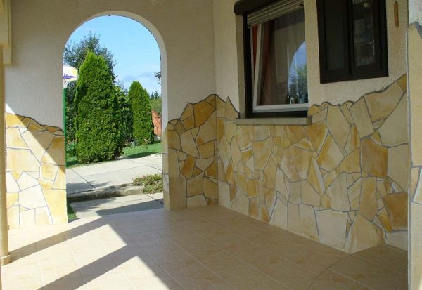 Η ακανόνιστη (natural stone) πλάκα Γεράνι έχει πάρα πολύ ίσιες επιφάνειες, με κίτρινο – μπεζ απαλό χρώμα. Σε πολλά κομμάτια παρουσιάζονται πολύ όμορφοι σχηματισμοί “δενδρίτες”.