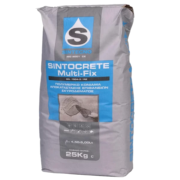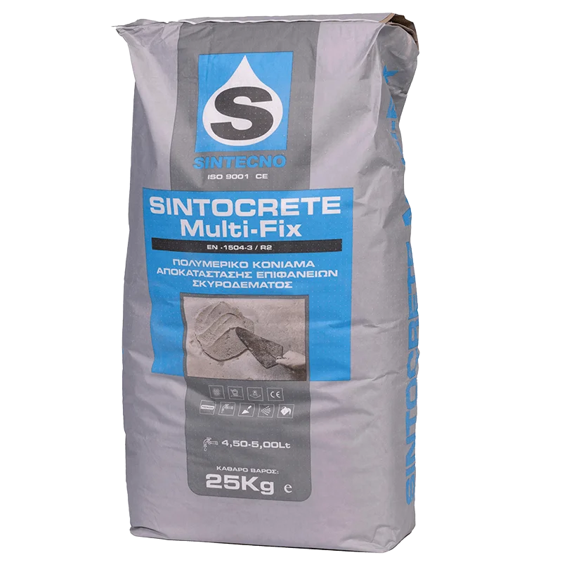 Το SINTOCRETE MultiFix είναι ενός συστατικού, ινοπλισμένο, τροποποιημένο με πολυμερή επισκευαστικό κονίαμα, σχεδιασμένο για αποκατάσταση επιφανειών σκυροδέματος. Είναι σταθερού όγκου, δεν περιέχει διαβρωτικά συστατικά και προσφέρει εξαιρετική πρόσφυση και αντοχή, καθιστώντας το ιδανικό για εσωτερική και εξωτερική χρήση. Πληροί τις απαιτήσεις του EN 1504-3 ως επισκευαστικό κονίαμα τύπου PCC R2.