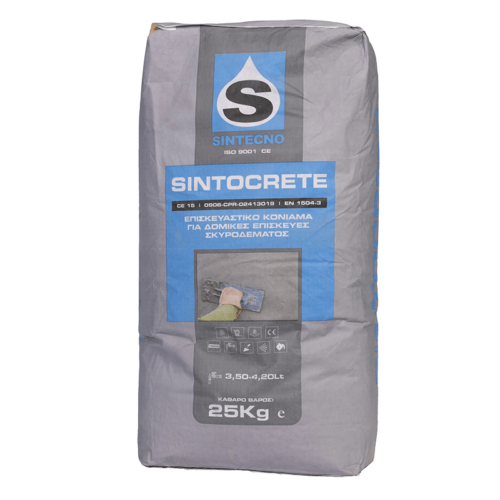 Το SINTOCRETE είναι ένα 1-συστατικού, έτοιμο προς χρήση, θιξοτροπικό επισκευαστικό κονίαμα τσιμεντοειδούς βάσης, ενισχυμένο με συνθετικές ίνες ακρυλικής βάσης και ειδικά πολυμερή, σχεδιασμένο για δομικές επισκευές υψηλών απαιτήσεων σε φέροντα στοιχεία οπλισμένου σκυροδέματος. Πιστοποιημένο κατά EN 1504-3 / Class R4, εγγυάται μέγιστη απόδοση σε έργα επισκευής και ανακατασκευής.