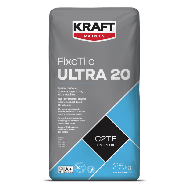 Το FixoTile Ultra 20 είναι κόλλα πλακιδίων τσιμεντοειδούς βάσης, ενισχυμένη με βινυλικές συμπολυμερείς ρητίνες για ισχυρή πρόσφυση και αυξημένη αντοχή στην υγρασία.
