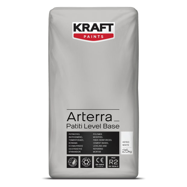 Το Arterra Patiti Level Base είναι ένα ρητινούχο, ινοπλισμένο, τσιμεντοειδές, λευκό κονίαμα εξομάλυνσης και επισκευής επιφανειών. Προσφέρει χαρακτηριστική εργασιμότητα, υψηλή ευκαμψία & επιφανειακή σκληρότητα. Η νέας τεχνολογίας σύνθεσή του είναι διπλά ενισχυμένη με ίνες πολυπροπυλενίου & ανθρακονημάτων, καθώς και φυσικές υδραυλικές συνδετικές ύλες ανακύκλωσης (Recycled Green Technology). Κατατάσσεται ως κονίαμα εξομάλυνσης τύπου CT-C25-F8 κατά ΕΝ 13813 και ως επισκευαστικό σκυροδέματος τύπου PCC R2 κατά ΕΝ 1504-3 & EN 1504-9:2008.