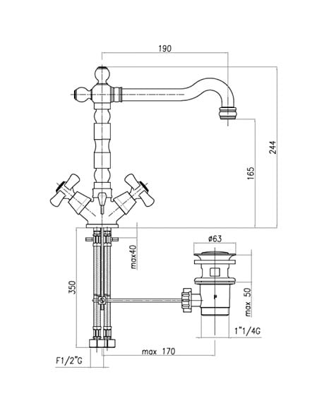 Επικαθήμενη retro μπαταρία νιπτήρος με αυτόματη βαλβίδα 1″1/4 μιας εξόδου gold με vintage ψηλό ρουξούνι και εύκαμπτο σωλήνα 35 1/2”, υψηλής ποιότητας και κατασκευής, από την σειρά Margot της Fiore.