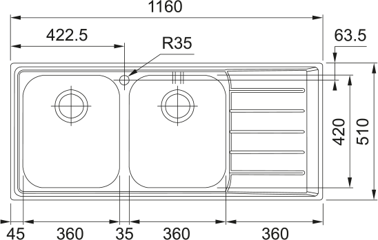 Ανοξείδωτος νεροχύτης Neptune NEX 621 1160x500mm, δεξιά ποδιά, ένθετη τοποθέτηση, περιλαμβάνει σιφόνια και βαλβίδες.
