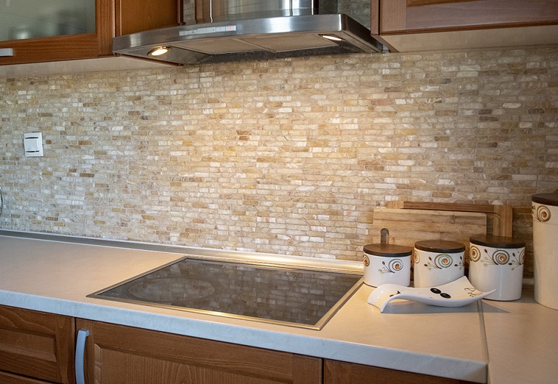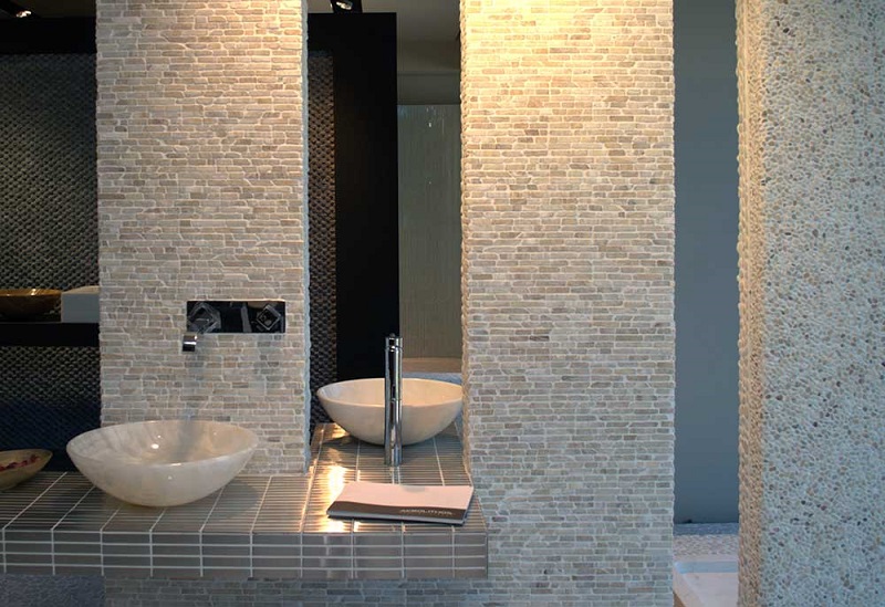 Το μωσαϊκό όνυχα δημιουργεί μια ενιαία μπεζ εικόνα , δίνοντας μια διαχρονική αξία στον χώρο.