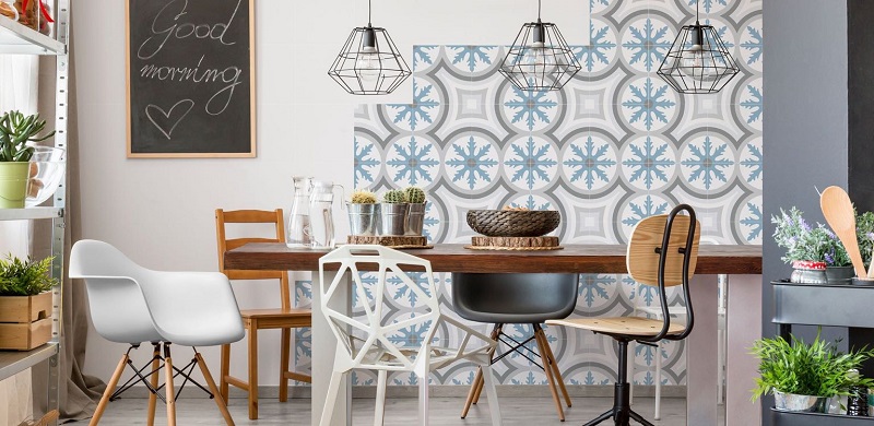 Χρώμα: Αποχρώσεις του μπλε, γκρι και λευκού με συνδυασμό διαφορετικών σχεδίων σε κάθε πλακάκι
