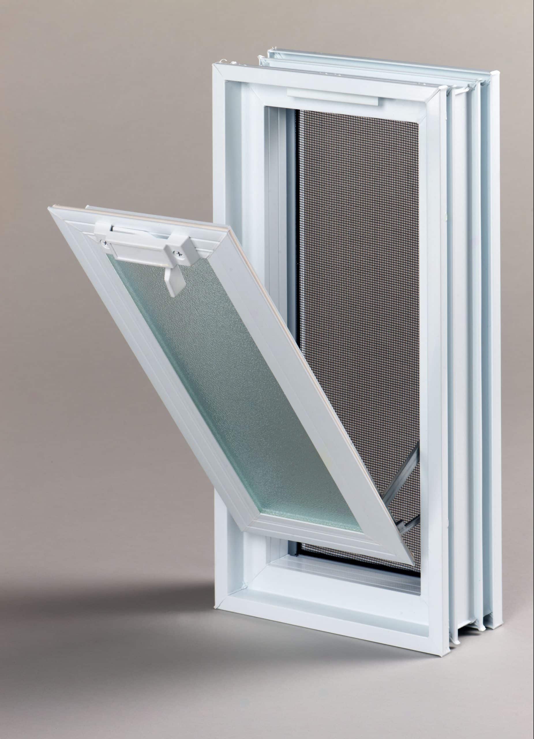 Πλαστικό παράθυρο με διπλό τζάμι και σήτα, κατάλληλο για αντικατάσταση 2 υαλότουβλων 19×19 cm, με δυνατότητα οριζόντιας ή κάθετης τοποθέτησης.