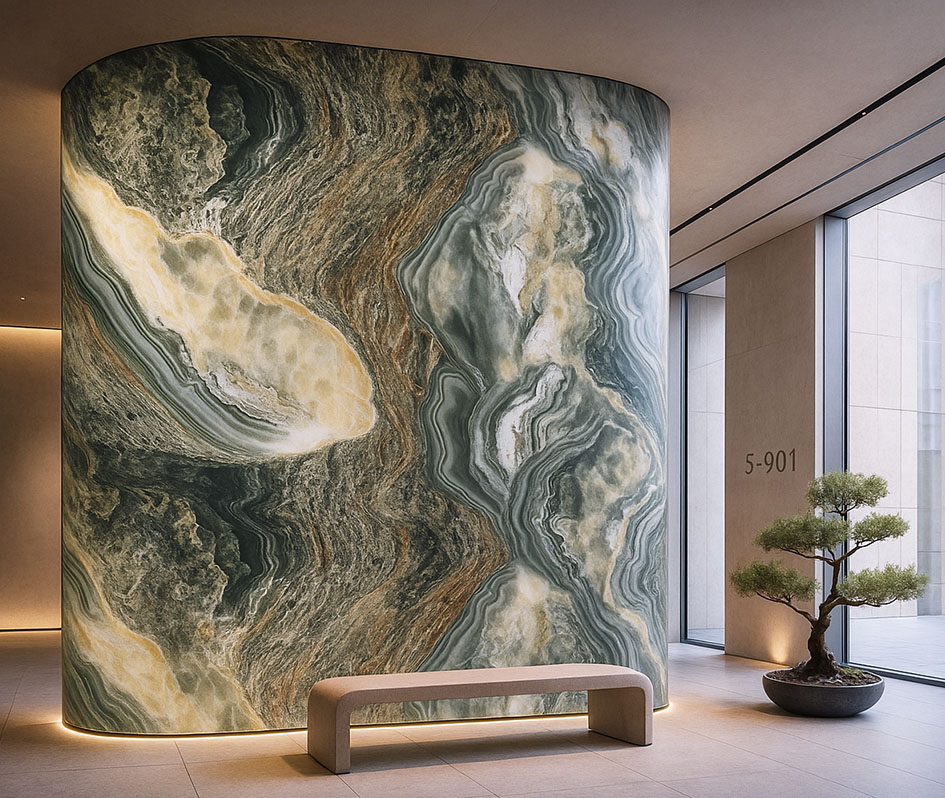 Διακοσμητικό panel τοίχου από PVC με όψη φυσικού μαρμάρου Onyx Green 901. Slim πάχος 2,8mm, πλήρως αδιάβροχο και ημιεύκαμπτο, ιδανικό για μπάνιο, κουζίνα και σύγχρονους εσωτερικούς χώρους.