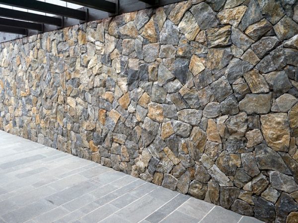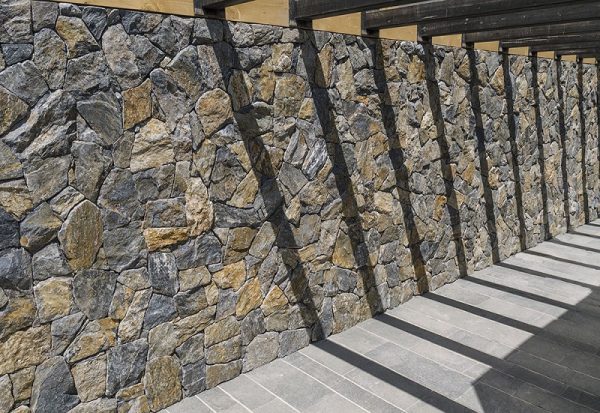 Τα σκούρα χρώματα της πέτρας Άκρον σε συνδυασμό με την ανάγλυφη επιφάνεια προσδίδουν ένα επιβλητικό ύφος στον χώρο.