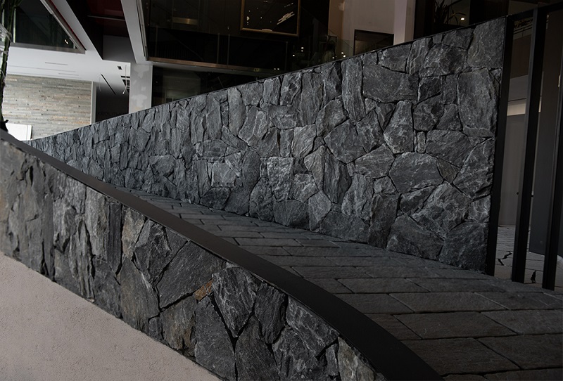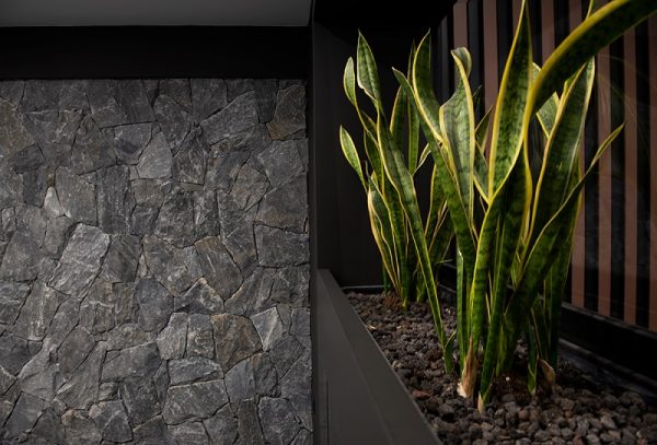 Το μαύρο χρώμα τονίζει την φυσική επιφάνεια της πέτρας προσδίδοντας έναν επιβλητικό χαρακτήρα στην επένδυση.
