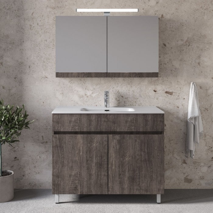 Ο λευκός νιπτήρας από πορσελάνη προσθέτει διαχρονική αισθητική, ενώ ο καθρέφτης-ντουλάπι με ράφι συνδυάζει λειτουργία και στυλ, προσφέροντας επιπλέον αποθηκευτικό χώρο. Τα πόδια από αλουμίνιο ολοκληρώνουν το σύνολο, προσφέροντας σταθερότητα και μοντέρνα εμφάνιση.
