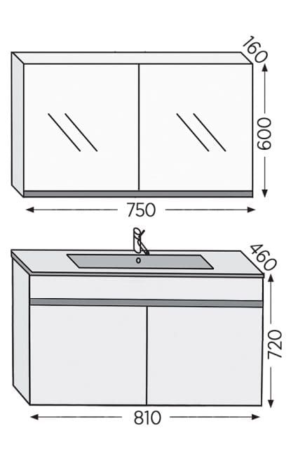 Ο λευκός νιπτήρας από πορσελάνη προσθέτει διαχρονική αισθητική, ενώ ο καθρέφτης-ντουλάπι με ράφι συνδυάζει λειτουργία και στυλ, προσφέροντας επιπλέον αποθηκευτικό χώρο. Τα πόδια από αλουμίνιο ολοκληρώνουν το σύνολο, προσφέροντας σταθερότητα και μοντέρνα εμφάνιση.`