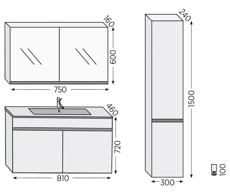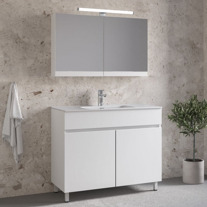 Ο λευκός νιπτήρας από πορσελάνη προσθέτει διαχρονική αισθητική, ενώ ο καθρέφτης-ντουλάπι με ράφι συνδυάζει λειτουργία και στυλ, προσφέροντας επιπλέον αποθηκευτικό χώρο. Τα πόδια από αλουμίνιο ολοκληρώνουν το σύνολο, προσφέροντας σταθερότητα και μοντέρνα εμφάνιση.