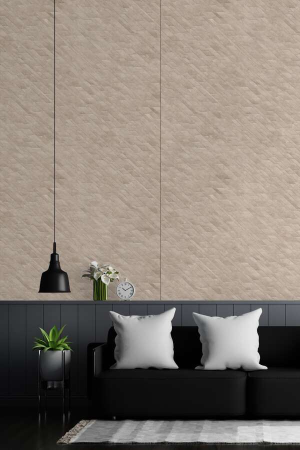 SPC panel επένδυσης τοίχου της συλλογής Rocko Tiles με μπεζ δημιουργικό ντεκόρ και διακριτική, σύγχρονη αισθητική.