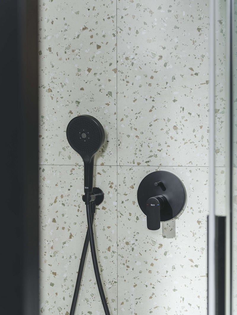 Εντοιχιζόμενη παροχή νερού με στήριγμα για τηλέφωνο ντους 1/2″ στρόγγυλη σε μαύρη ματ , από την σειρά Aqua round της Roca.